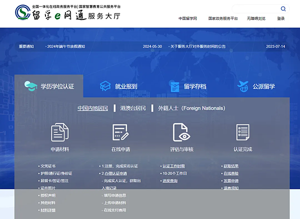 点击学历学位认证、在线办理,实名认证,得到出入境记录,填写基本信息、申请类型申请信息、学历经历、上传资料、确认提交、在线支付……等等步骤后则可完成申请。