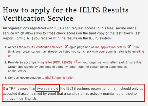 如果TRF超过两年,雅思合作伙伴建议只有在考生积极保持或努力提高英语水平的情况下才能接受。