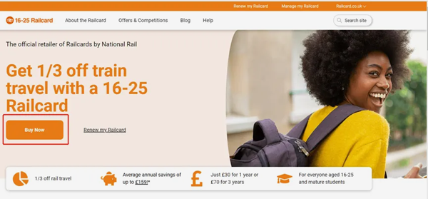 首先,打开浏览器,进入网站www.16-25railcard.co.uk,进入官方网站,点击“Buy Now”,如下图所示: