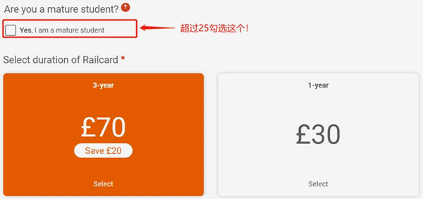 之后我们需要选择卡的有效期,本科生可以选择三年 70 英镑的卡。需要注意的是,如果你的年龄超过 25 岁,记得在 "Yes, I am a mature student "一栏打勾,如下图所示: