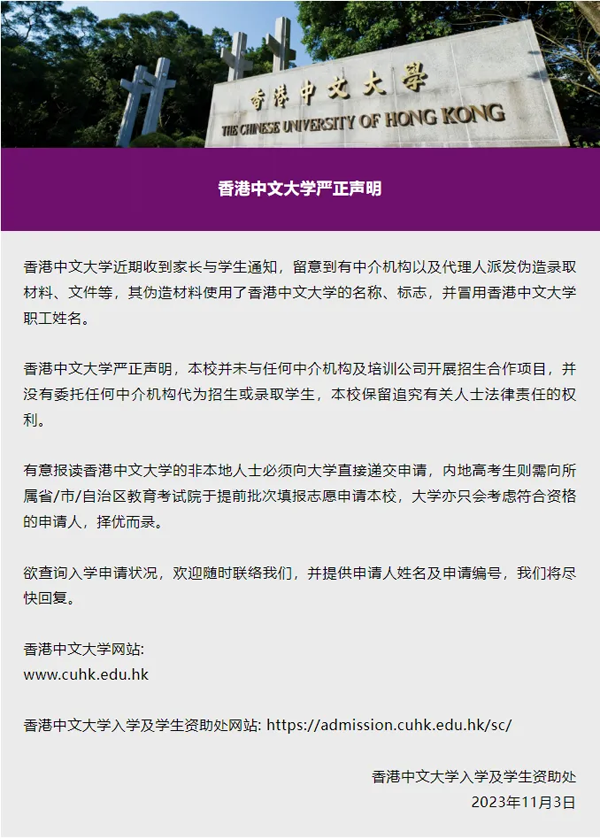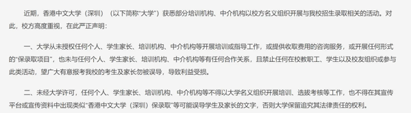 港中文严正声明:“本校并未与任何中介机构及培训公司开展招生合作项目,并没有委托任何中介机构代为招生或录取学生,本校保留追究有关人士法律责任的权利。”