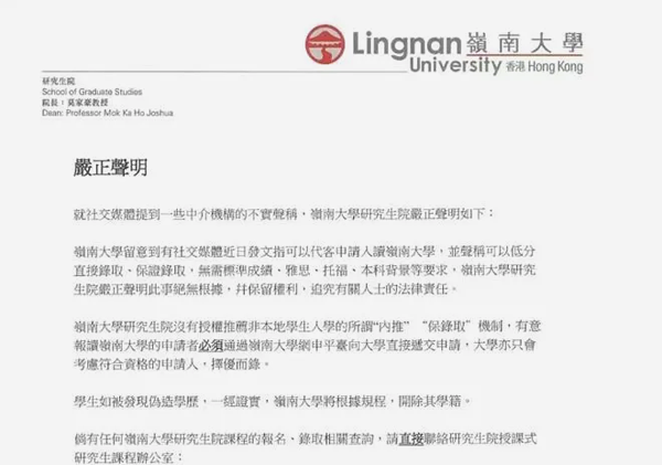 岭南大学直接出公告声明,中介说的一切都是假的。