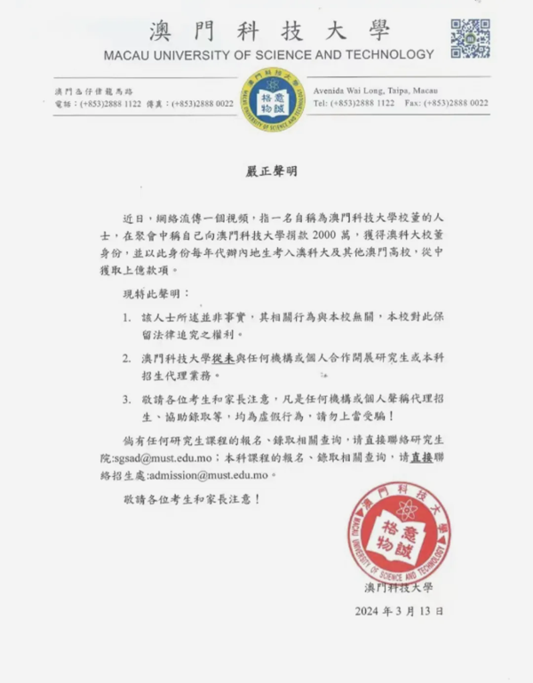 澳科大了解到此事后,迅速发布了一条辟谣声明。