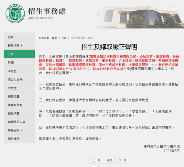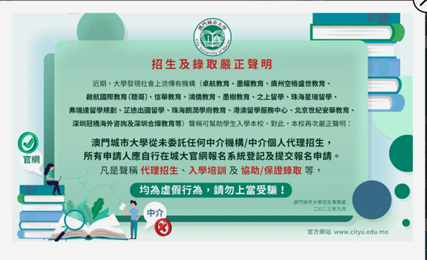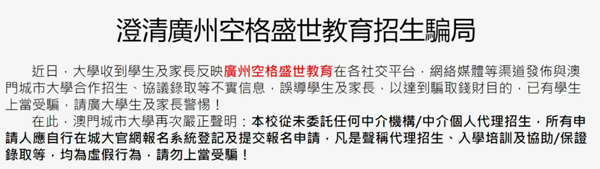 澳门城市大学也不止一次在招生页面挂“防骗警告”。