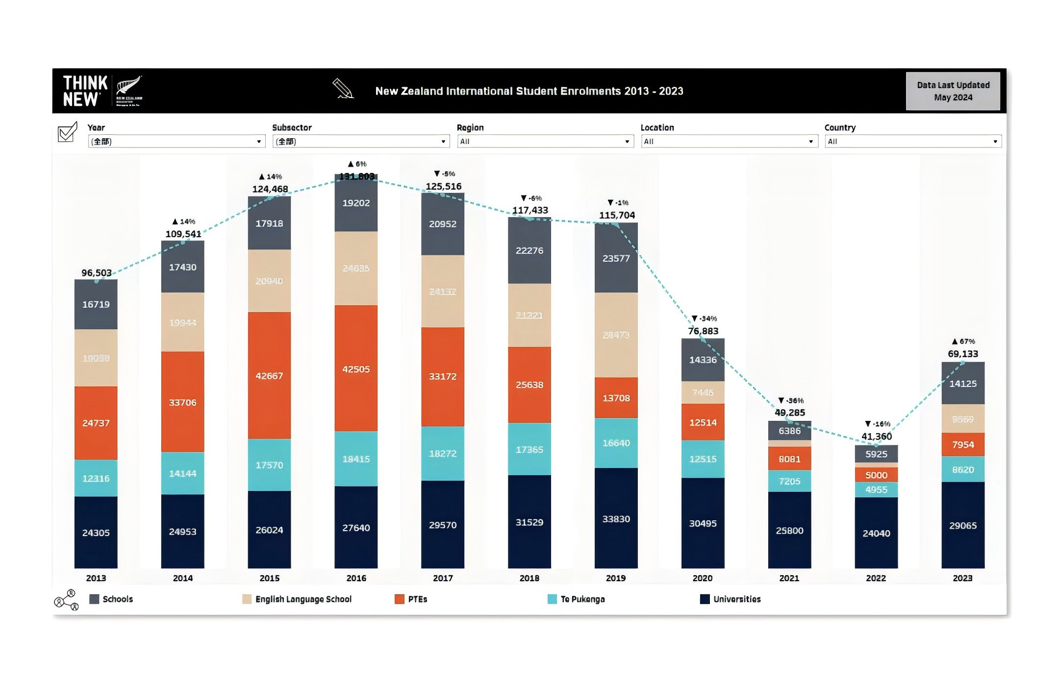 2023年全年国际学生入学总数激增至69,133人,与2022年相比实现了令人瞩目的67%的增长率。