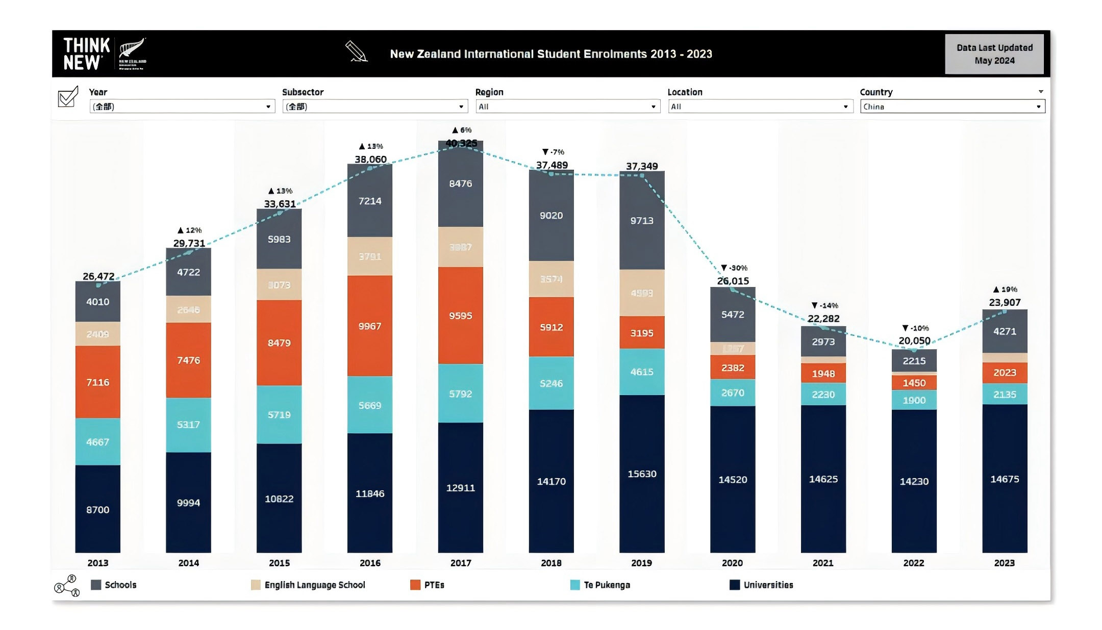 尤为突出的是,中国留学生继续领跑,具体人数为23,907名,占据了留学生总数的35%份额,相比2022年增长了19%。