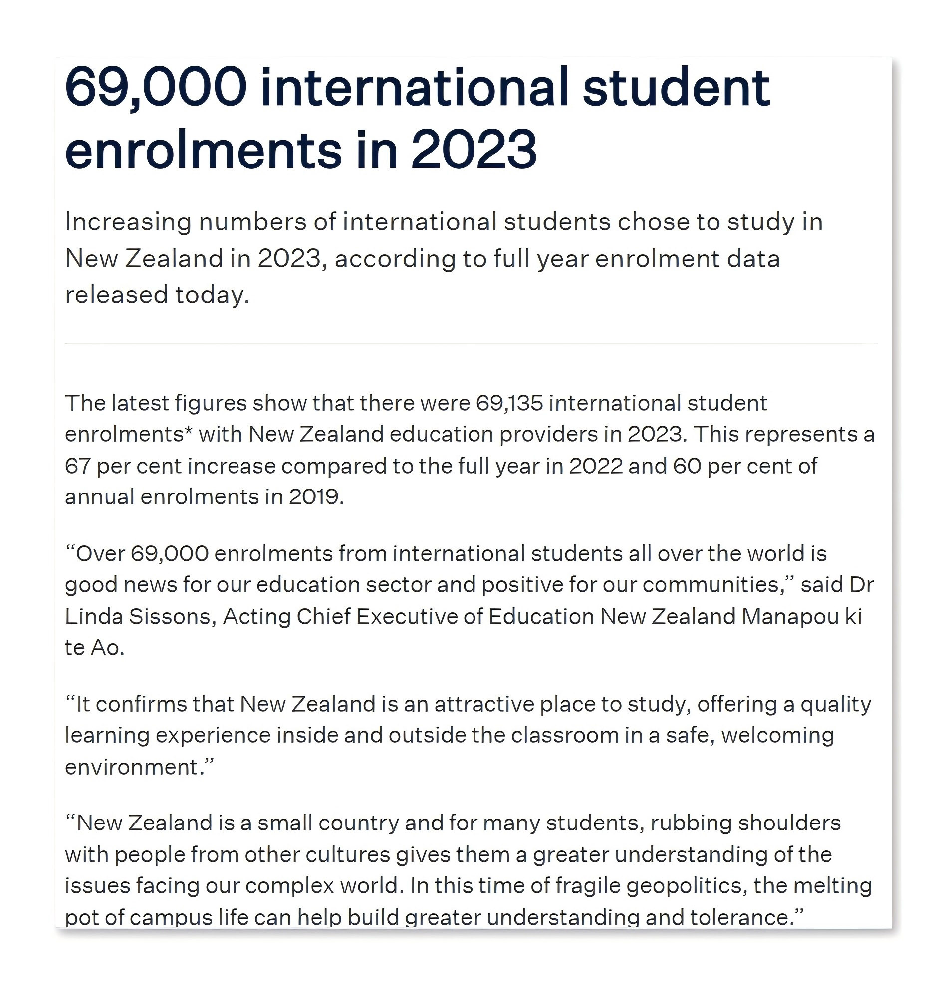 “来自世界各地的 69,000 多名国际学生入学对我们的教育部门来说是个好消息,对我们的社区来说是积极的。它证实了新西兰是一个有吸引力的学习之地,在安全、温馨的环境中提供课堂内外的优质学习体验。”