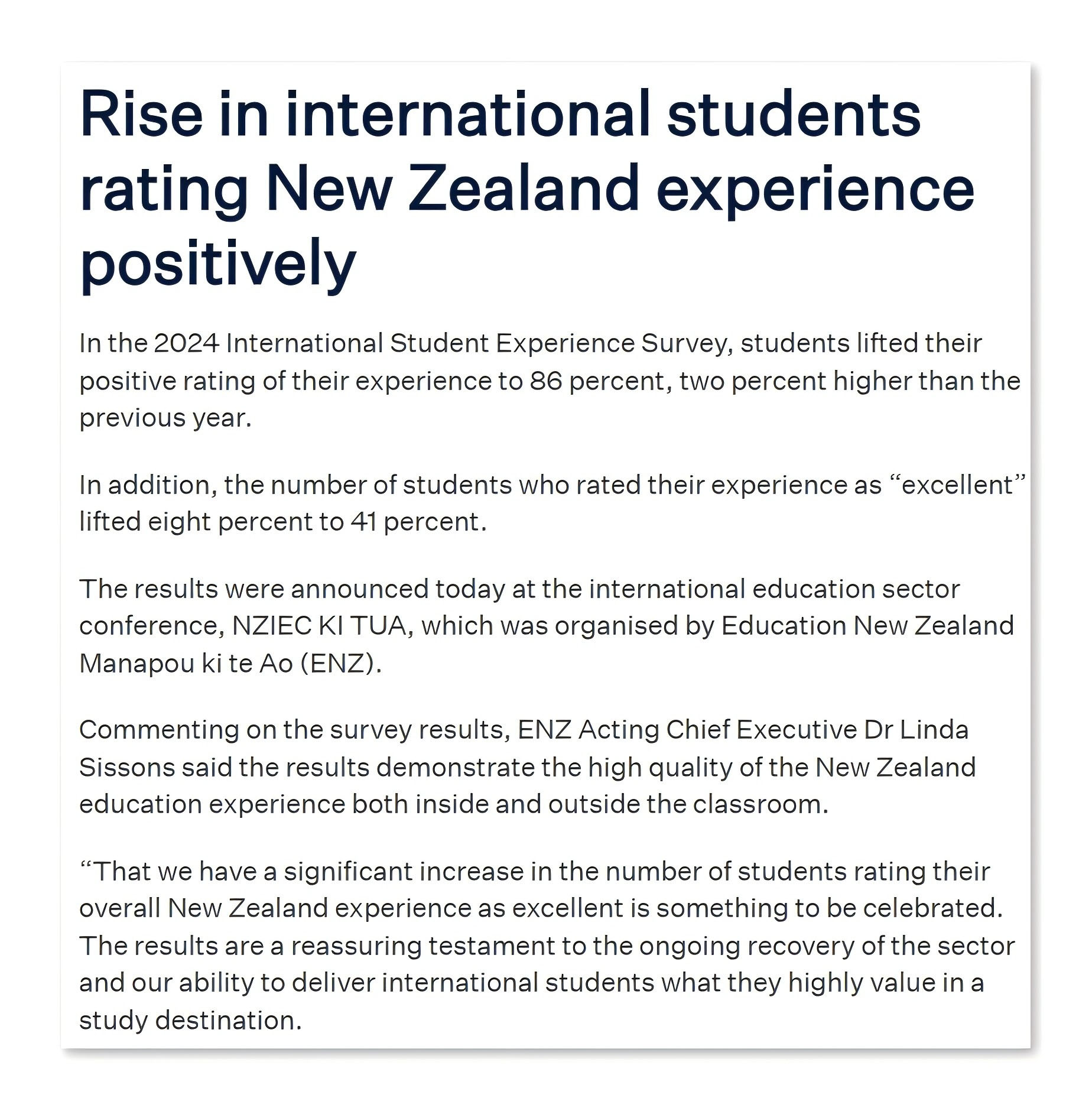 在 2024 年国际学生体验调查中,国际学生将新西兰的整体经历评为“优秀”的比例为41%,高于 2023 年的 33%。