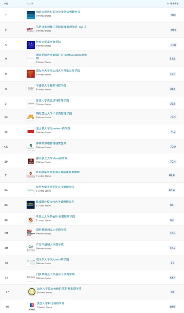 在商业分析硕士全球Top50榜单中,美国占据了21个席位,以下是进入该领域全球前50的美国高校: