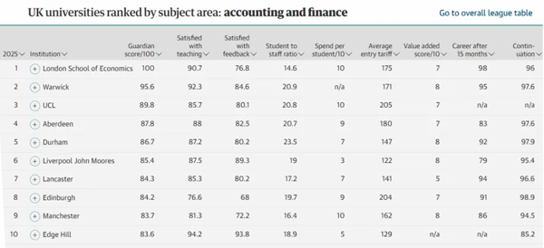 此外,卫报还发布了专业榜单。虽然有些学校的综合排名不突出,但凭借其强势专业依然享誉全球。在某些热门专业领域中,甚至有一些你可能不熟悉但表现亮眼的宝藏院校。