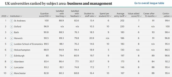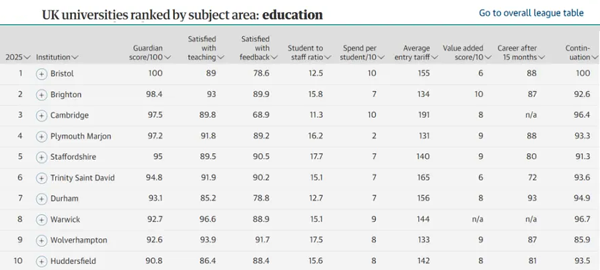 英国《卫报》(The Guardian)发布了2025英国大学排名!