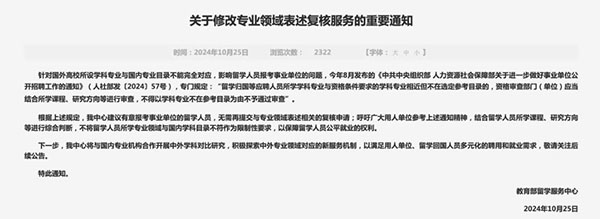 2024年10月25日,教育部留学服务中心发布通知,建议有意报考事业单位的留学人员,无需再提交与专业领域表述相关的复核申请。