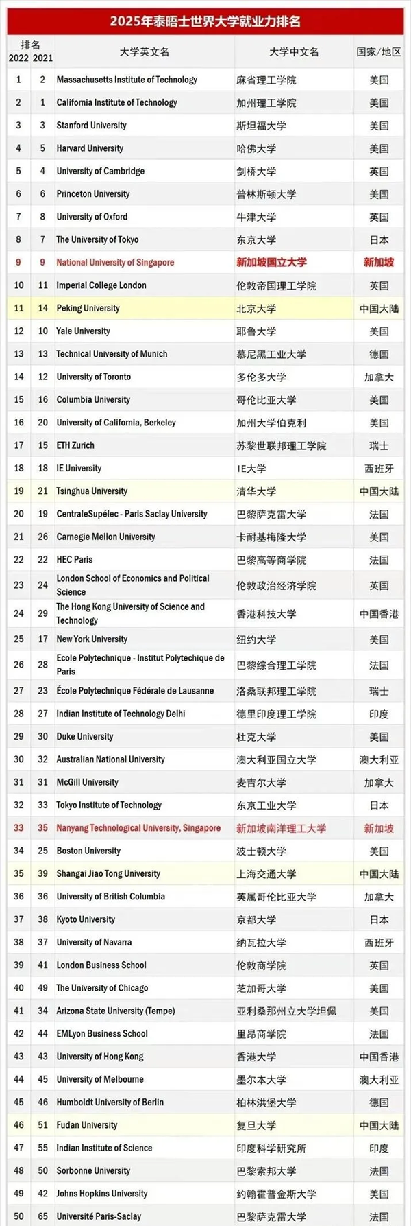 新加坡有两所高校上榜,分别是新加坡国立大学(第9位)和南洋理工大学(第33位)。