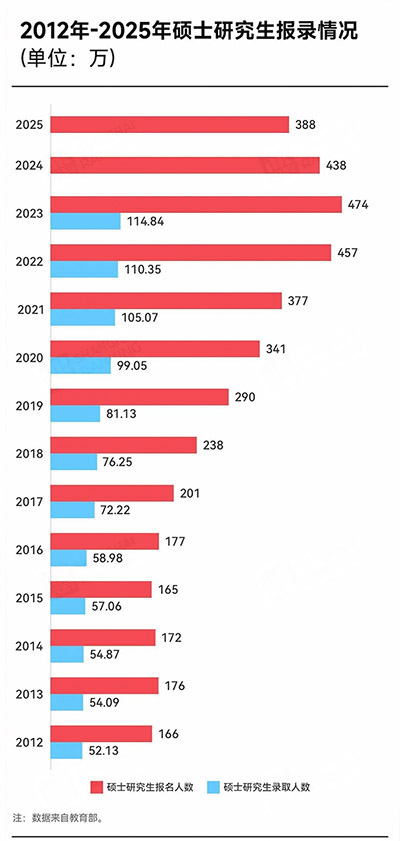 2023 年考研报名人数达到了 474 万的高峰,2024 年稍有下降,为 438 万。而到了 2025 年,报名人数大幅降至 388 万,相比上一年减少了整整 50 万人。从这些数据可以清晰地看出,考研人数的下降趋势明显且幅度较大。