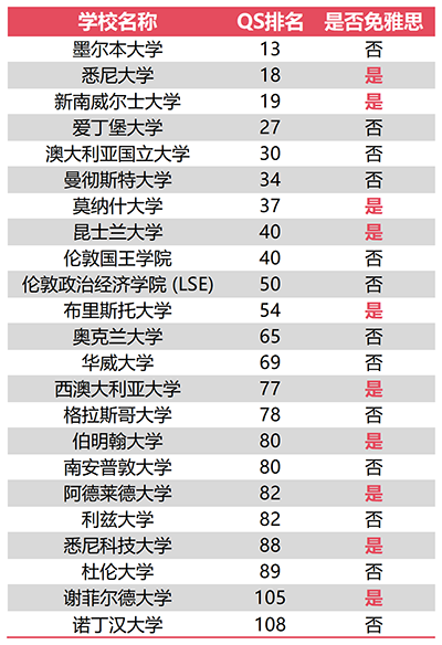 以上为全球前百名校对我院学生的免雅思情况统计。除此之外,QS100-200的学校中,80%左右目前也都可减免雅思,且越来越多学校对我院学生实施免雅思政策。例如英国纽卡斯尔大学(QS 排名第129位)、利物浦大学(QS 排名第 165位),也是从近2年陆续针对我校学生开放免雅思政策,相信以后会争取到更多学校开放雅思条件。